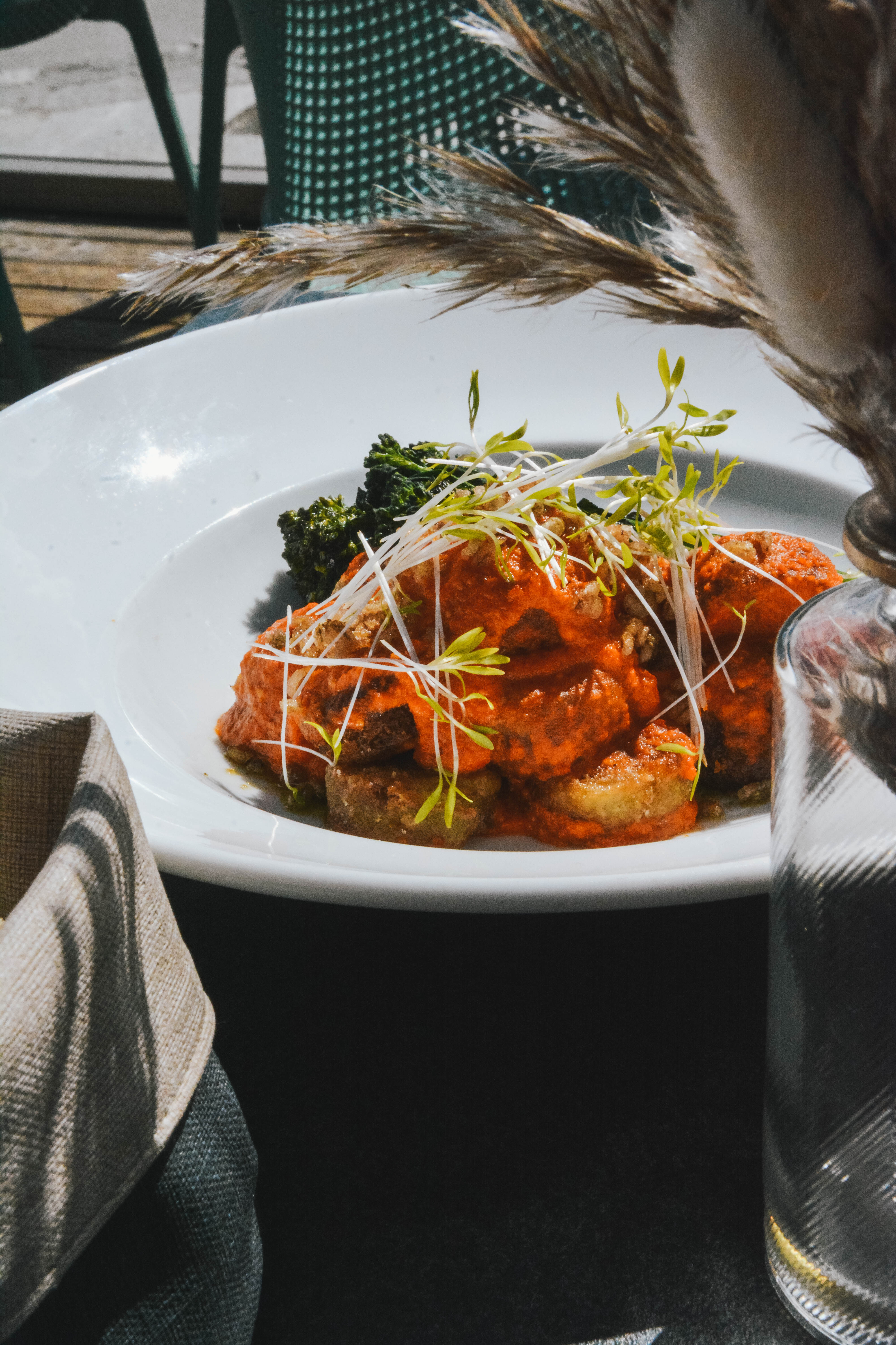 Broccoli Gnocchi: A creative, plant-based option, served with rich romesco sauce and crispy spiced pearl barley.